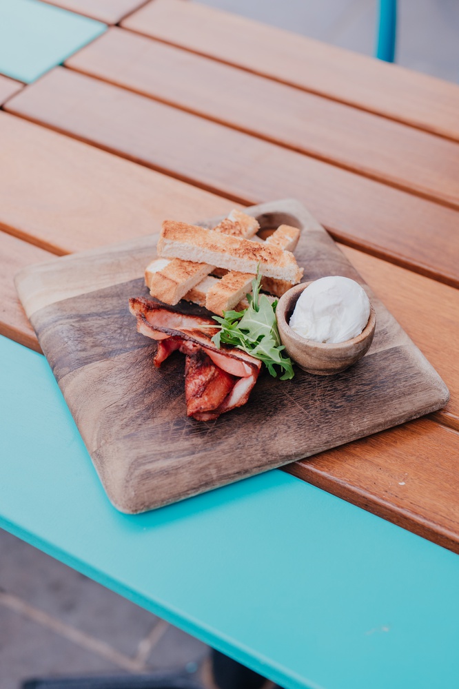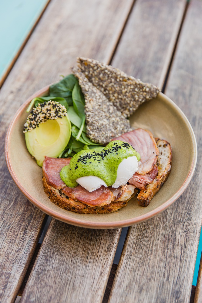 Bacon served with fried sourdough, poached egg, Bangalow ham, raw spinach, avocado, kale mayonnaise, and hemp seed cracker.