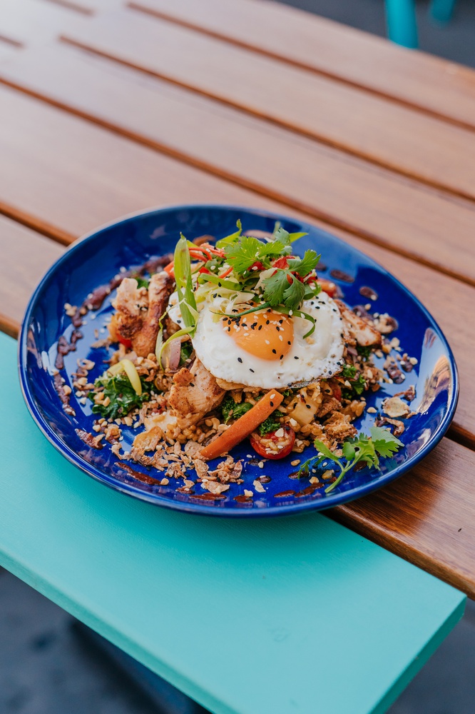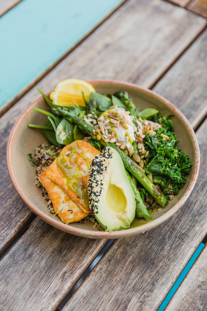 Byron Bowl served with fried sourdough, poached egg, Bangalow ham, raw spinach, avocado, kale mayonnaise, and hemp seed cracker.