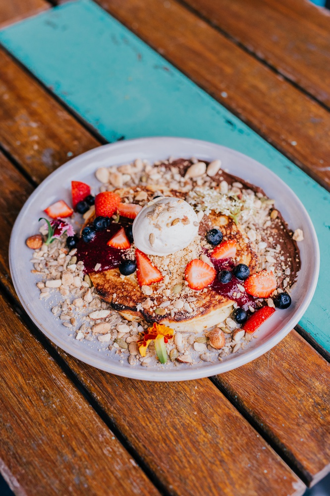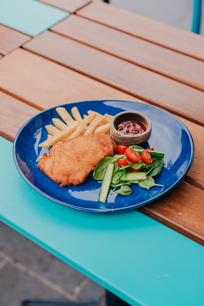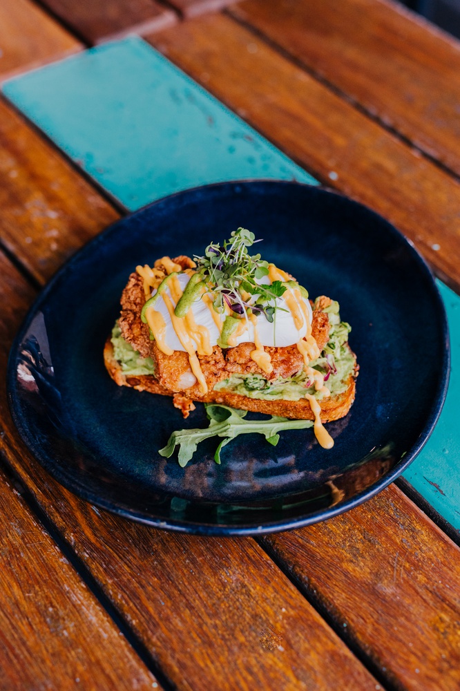 Fish&Chips served with fried sourdough, poached egg, Bangalow ham, raw spinach, avocado, kale mayonnaise, and hemp seed cracker.
