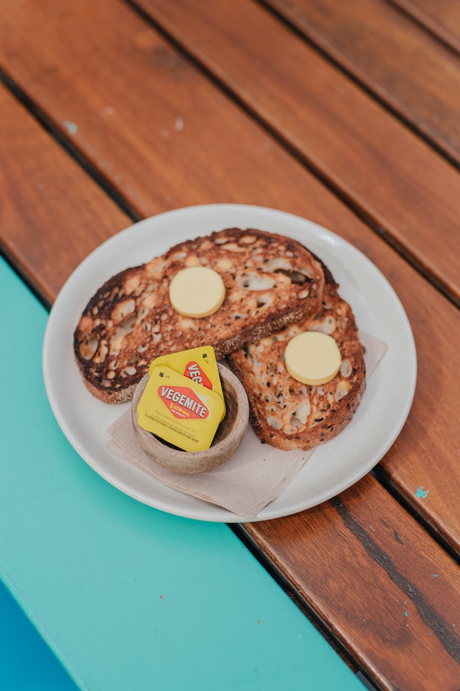 Two sliced breads served with fried sourdough, poached egg, Bangalow ham, raw spinach, avocado, kale mayonnaise, and hemp seed cracker.